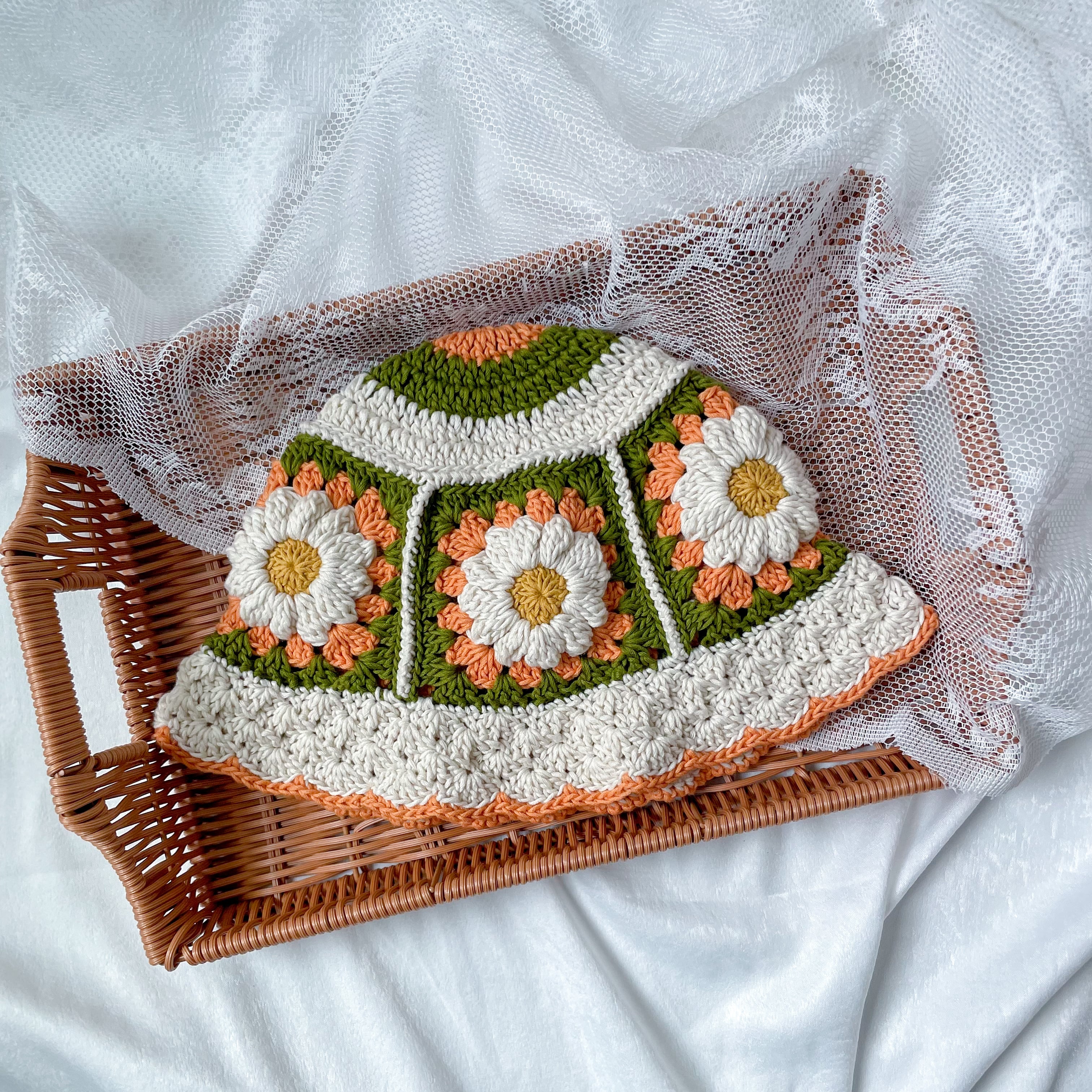 ぽこぽことしたお花のモチーフを繋げたバケットハットです。