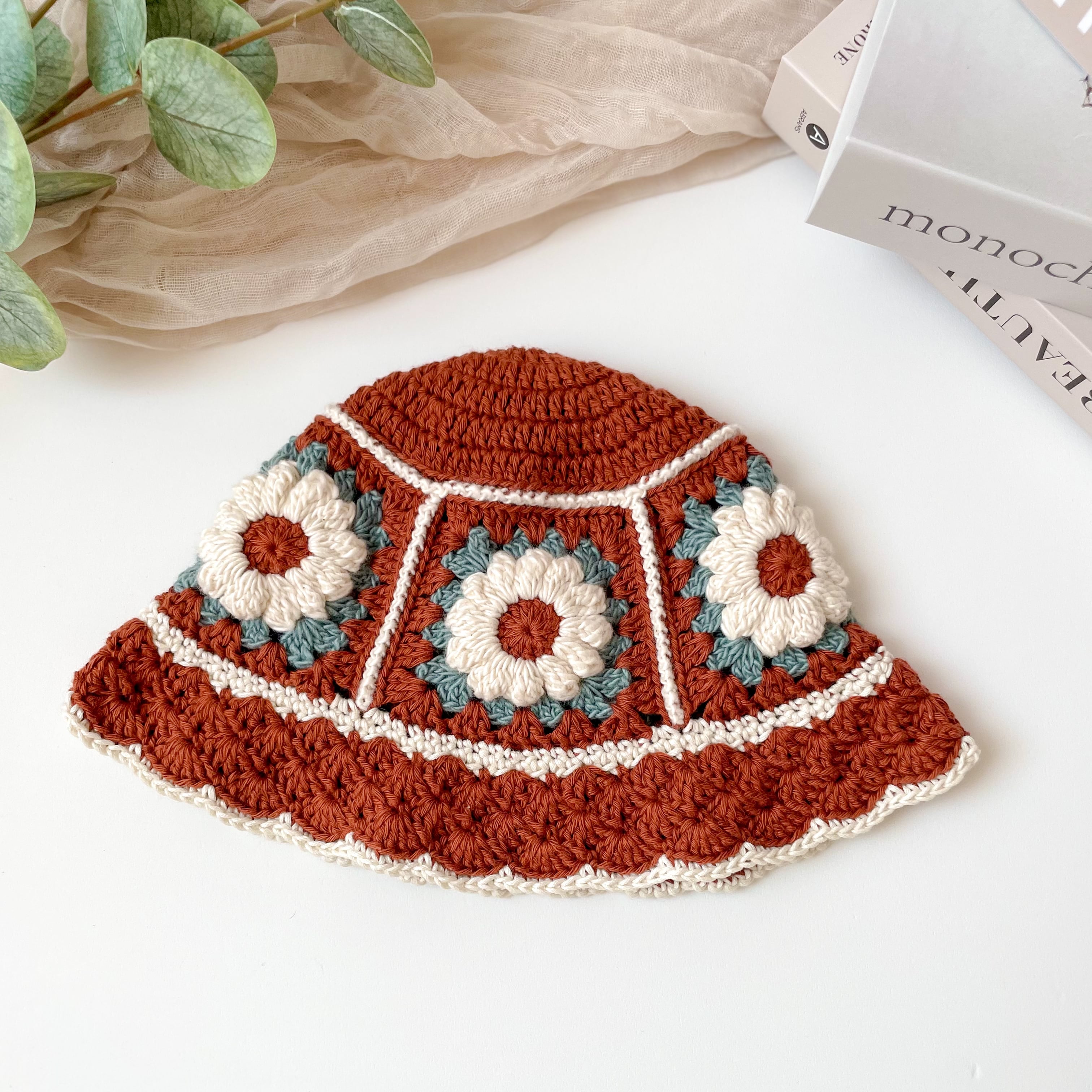 ぽこぽことしたお花のモチーフを繋げたバケットハットです。