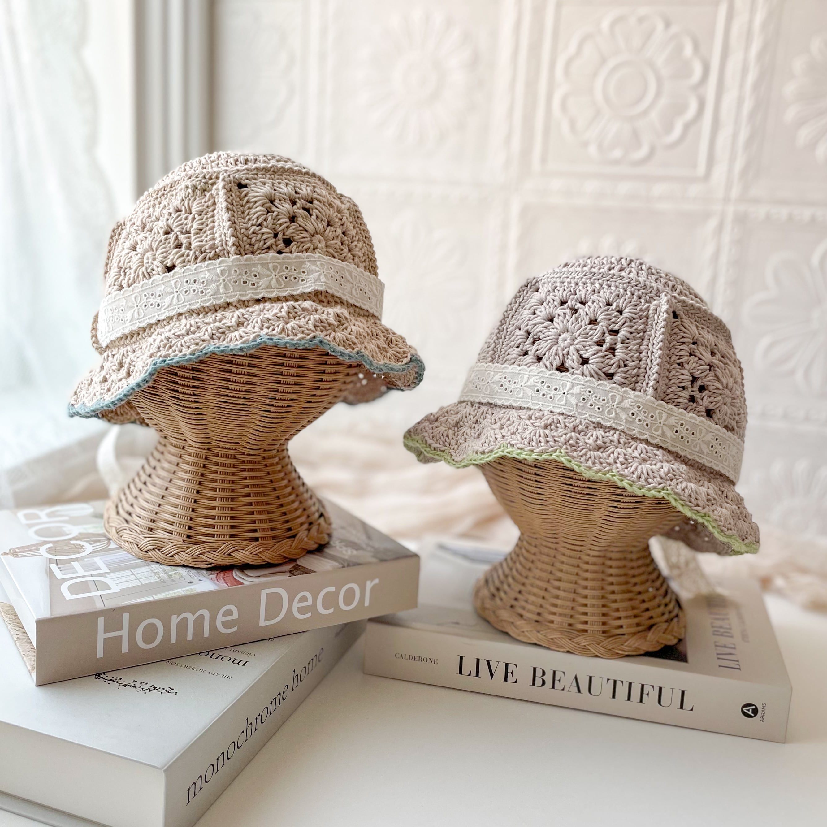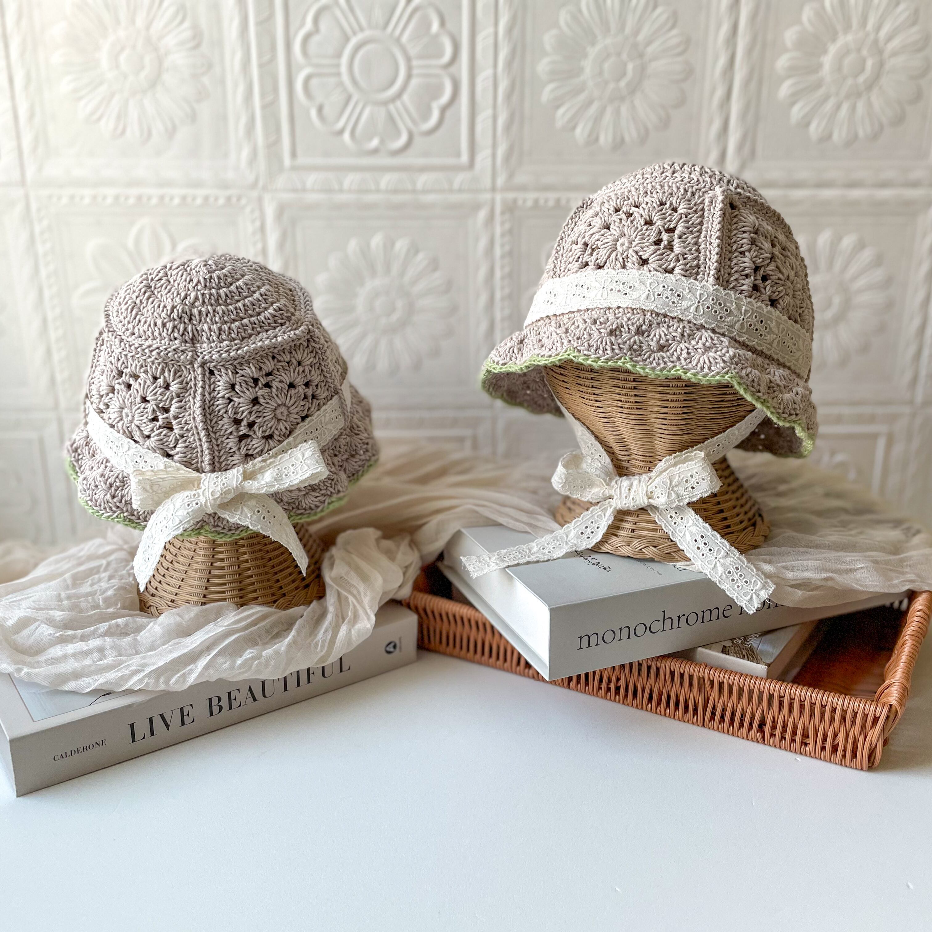 お花のモチーフを繋げたバケットハットです。
